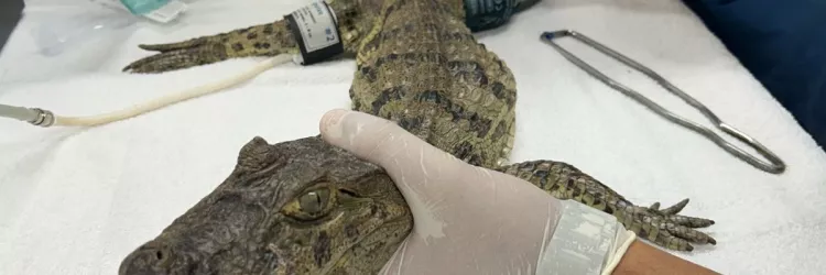 Jacaré resgatado pelo CETAS, com anzol no esôfago, passa por procedimento médico