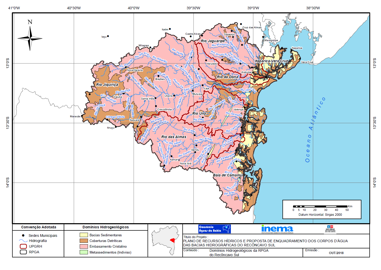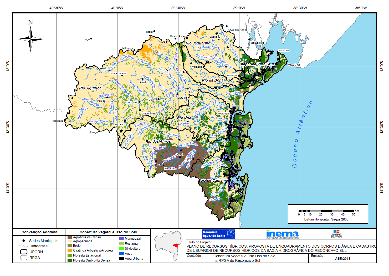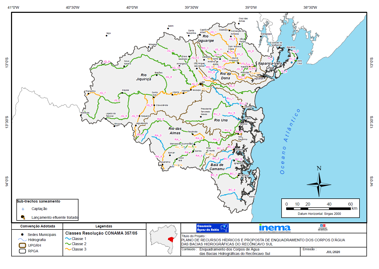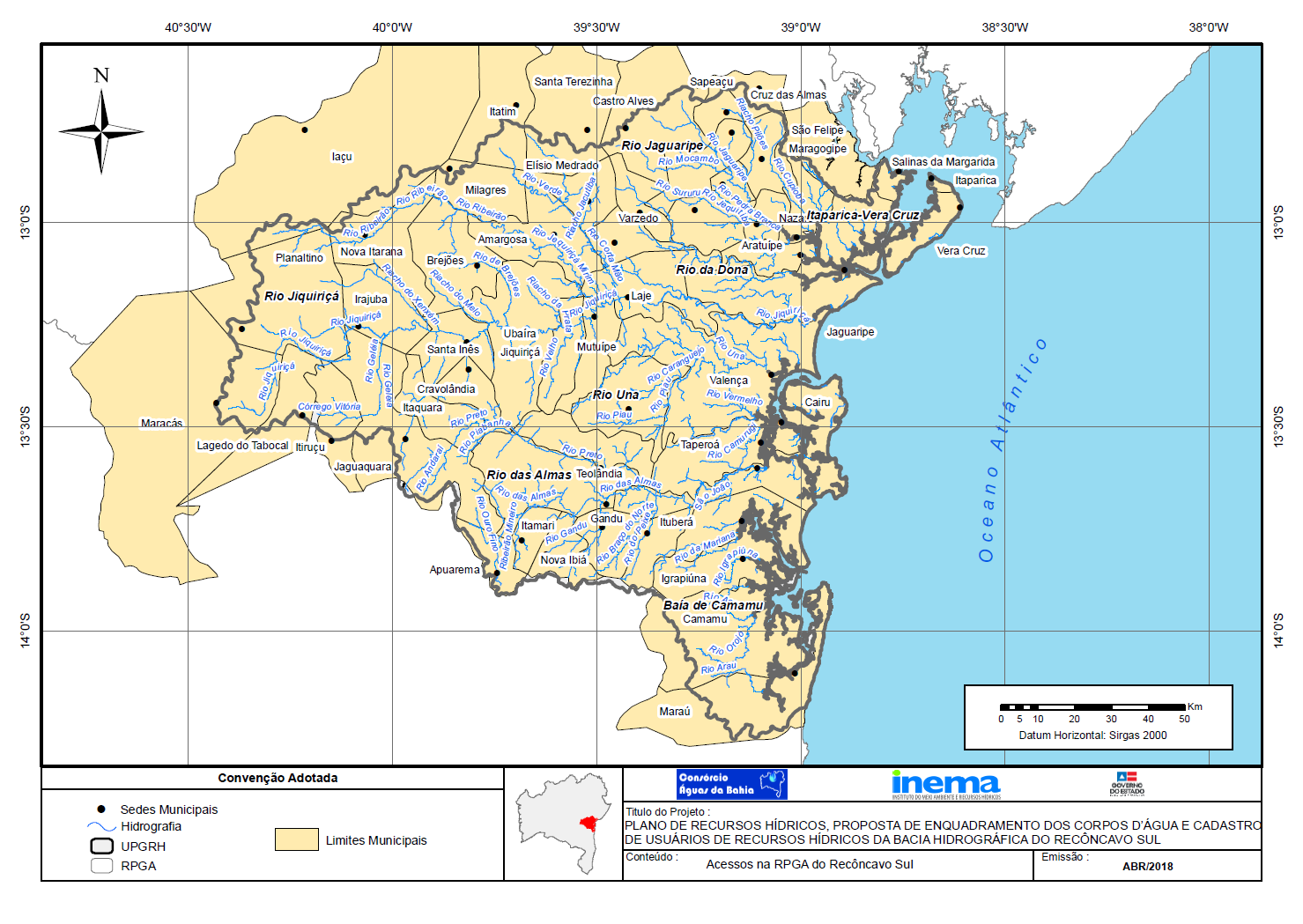 Em fevereiro de 2013, o Governo do Estado da Bahia, por intermédio do Instituto do Meio Ambiente e Recursos Hídricos (INEMA), contratou o Consórcio Águas da Bahia para elaborar, junto ao Comitê das Bacias Hidrográficas do Recôncavo Sul, o Plano de Recursos Hídricos e a Proposta de Enquadramento dos Corpos d\'Água das Bacias Hidrográficas do Recôncavo Sul.