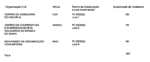 Atividade contemplada por meio do Chamamento Público nº 01/2022 que resultou na celebração de Termos de Colaboração com organizações da sociedade civil, para cadastramento de 307 imóveis rurais em territórios de povos e comunidades tradicionais, assim distribuídos: