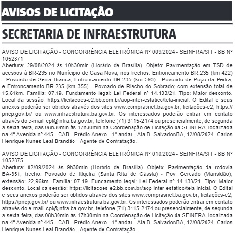 No Norte do estado, um total de 15,6 km de acessos aos povoados de Casa Nova, que são Serra Branca, Poço da Pedra e Riacho do Sobrado, irão passar por pavimentação. O aviso de licitação das ações a serem feitas nos trechos que ligam os três povoados com o entroncamento da BR-235 também saiu no DOE desta terça-feira (13). Além de melhorar o deslocamento dos moradores dos povoados em direção à sede municipal ou Juazeiro, os serviços vão beneficiar o escoamento da produção agrícola, como manga, uva, melancia, goiaba e coco, e da pecuária, principalmente de caprinos. Os envelopes com as propostas serão abertos em 29 de agosto.