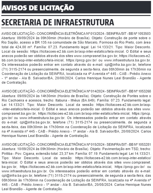 O trecho asfaltado vai beneficiar mais de 17 mil habitantes de Piritiba. Na licitação, a abertura dos envelopes com as propostas das empresas interessadas, que é a próxima etapa, acontecerá em 10 de setembro. Na última quarta (21), os processos licitatórios também foram iniciados para a construção de pontes pela Seinfra no Sul e Extremo Oeste baiano.