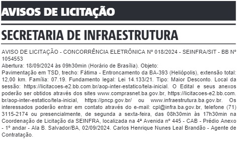 Para quem mora na região do Semiárido baiano, o tempo de viagem de 2 horas até o Litoral Norte do estado a fim de aproveitar as praias reduzirá pela metade com a pavimentação da ligação entre Fátima e o entroncamento da BA-393, em Heliópolis. Com o investimento de R$ 16 milhões, a ação nos 12 km de extensão será realizada pelo Governo da Bahia, através da Secretaria de Infraestrutura do Estado (Seinfra). O processo licitatório da obra já está em andamento após a publicação do aviso no Diário Oficial do Estado (DOE) da última quarta-feira (03).