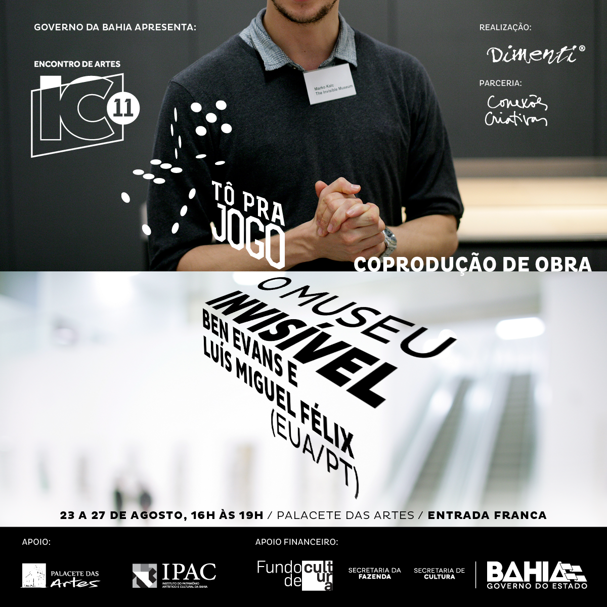 Movida a partir do lema Tô Pra Jogo, a 11ª edição do IC – Encontro Internacional de Artes leva ao Palacete das Artes, O Museu Invisível, que terá visitação gratuita de 23 a 27 de agosto (quarta a domingo), das 16h às 19h. Criada pelo norte-americano Ben Evans e o português Luís Miguel Félix, artistas atuantes entre EUA e Europa, a experiência terá uma remontagem baiana: com direção da dupla, a Dimenti Produções Culturais assina esta coprodução, reunindo um elenco de artistas locais, numa intervenção que questiona a transmissão de obras de arte e a definição fundamental de museu. Não há nada material para ser visto nessa coleção, composta apenas por descrições de objetos, experiências e situações, numa troca com o espectador. O roteiro de visitas cresce, muda a aparência ou desaparece, a partir da relação estabelecida entre cada guia e visitante.