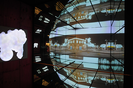 Instalada na parte interna do stand do Instituto do Patrimônio Artístico e Cultural da Bahia (IPAC), a peça de 3 por 3m, assinada pelo artista visual, cenógrafo e diretor de arte Joãozito, exibe imagens do trabalho do órgão projetadas ao fundo e refletidas em espelhos instalados com angulação específica, formando um imenso globo.