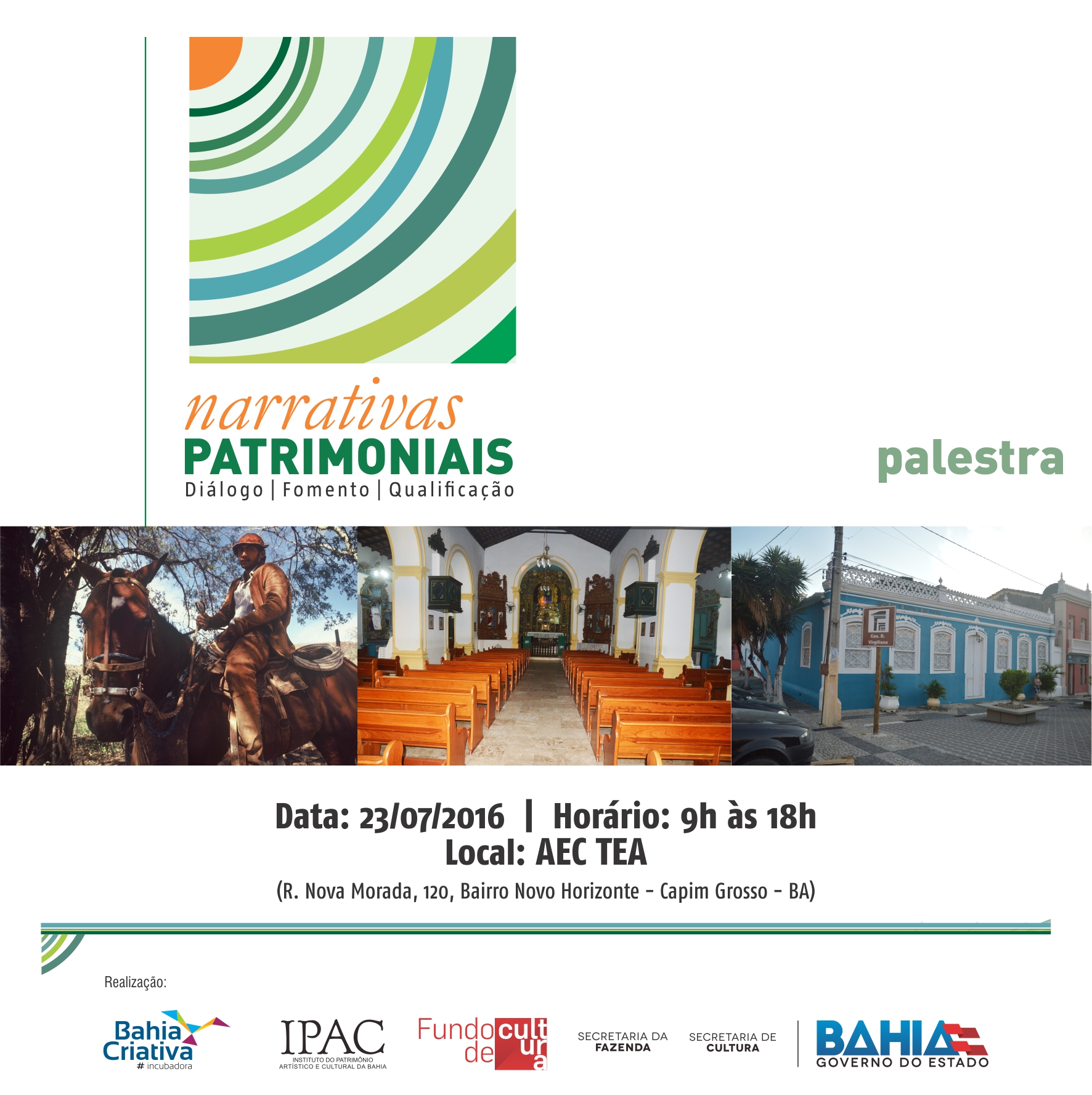 Neste sábado (23) a cidade de Capim Grosso, localizada a 272 km de Salvador, sedia o programa ‘Narrativas Patrimoniais’ que promove cursos, oficinas, palestras e workshops gratuitos com objetivo de qualificar, dialogar e fomentar as áreas do patrimônio cultural (material e imaterial) e de museus (acesse:http://goo.gl/DjyRn2). O evento será de 9h às 18h, na Associação Tarcília Evangelista, com a consultoria ‘Enquadramento de Projeto Cultural’. Inscrição gratuita via endereço bahia.criativa@cultura.ba.gov.br e telefone (71) 3319-0033.