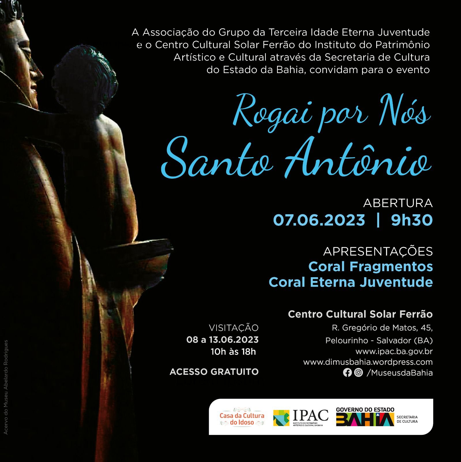 Rogai por nós, Santo Antônio! Na próxima quarta-feira (07), a partir de 9h30, o Centro Cultural Solar Ferrão, museu administrado pelo Instituto do Patrimônio Artístico e Cultural da Bahia (IPAC), e a Associação do Grupo da Terceira Idade Eterna Juventude, celebrarão um dos atos de fé mais populares do Nordeste, a reza do Santo Antônio. A atividade é gratuita e será realizada no Centro Cultural Solar Ferrão (R. Gregório de Matos, 45 - Pelourinho, Salvador – BA).