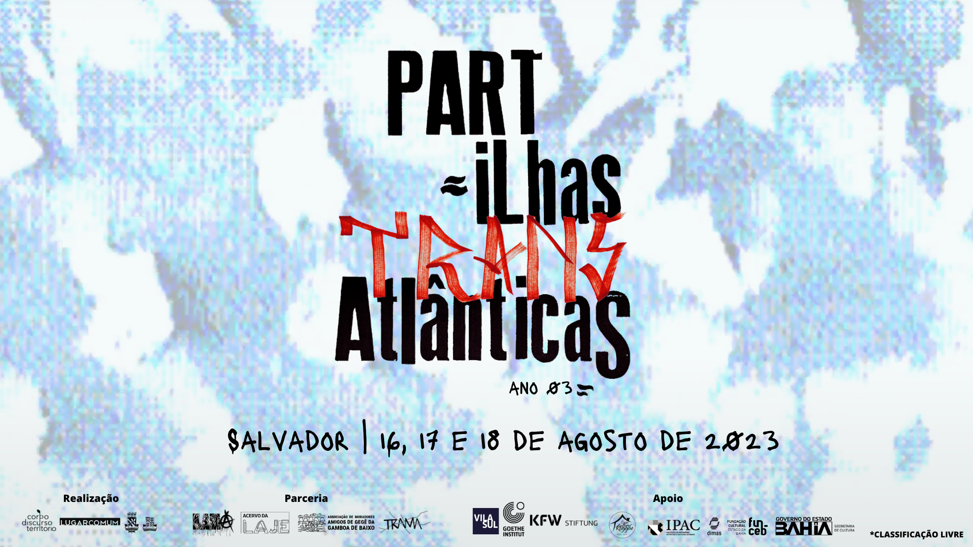 Neste ano, o "Partilhas Transatlânticas" retorna ao formato presencial e acontecerá entre os dias 16 e 18 de agosto de 2023, em Salvador (BA). Tomando a cidade como chão do cruzamento entre África, Europa e Brasil, o tema "Investigações sobre cidades e linguagens" orienta as atividades que acontecerão na Sala de cinema Walter da Silveira, no Goethe Institut, no Centro Cultural Solar Ferrão e na Casa Cultural Reggae. A programação conta com mostra de curtas, bate-papos, conversas sonoras com realizadores, artistas e pesquisadores de diferentes campos de saberes, práticas e visões de mundo. Permeados por realizações audiovisuais, literatura, artes visuais e música, os caminhos e as reflexões sobre as vidas urbanas e o fazer cidade no Atlântico Negro serão mobilizados a partir de suas dimensões estéticas, éticas, políticas e criativas.