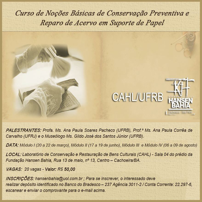A Fundação Hansen Bahia (FHB) em parceria com o Centro de Artes Humanidade e Letras (CAHL) da Universidade Federal do Recôncavo da Bahia (UFRB) promove curso de Noções Básicas de Conservação Preventiva e Reparo de Acervo em Supor te de Papel.A carga horária será de 60h, divididas em quatro módulos de aulas teóricas expositivas com recursos de audiovisuais e aulas práticas. As aulas serão ministradas pela Profa. Ms. Ana Paula Soares Pacheco (UFRB), Prof.ª Ms. Ana Paula Corrêa de Carvalho (UFRJ) e o Museólogo Ms. Gildo José dos Santos Júnior (UFRB).