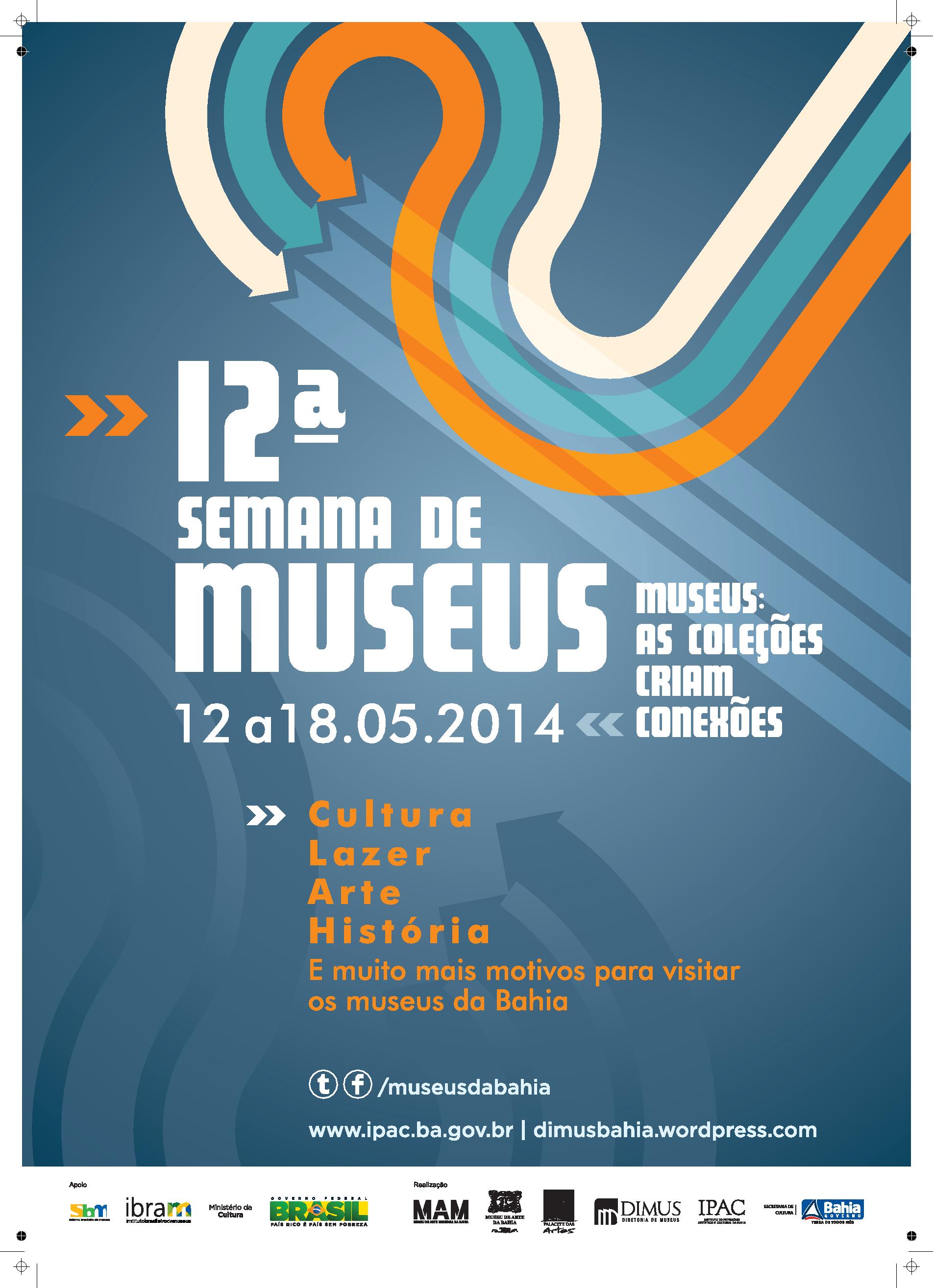 A 12ª Semana de Museus, uma realização do Instituto Brasileiro de Museus (Ibram/MinC) articulada na Bahia pela Diretoria de Museus do Instituto do Patrimônio Artístico e Cultural da Bahia (DIMUS/IPAC), já tem sua programação definida e acontecerá entre os dias 12 a 18 de maio de 2014. Para o evento – nacional –as instituições museológicas promovem ações voltadas para uma temática específica que, nesta edição, será: “Museus: as coleções criam conexões".