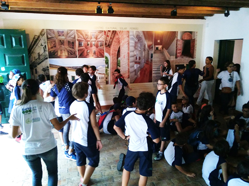 O Centro Cultural Solar Ferrão (Rua Gregório de Mattos, nº45), no Pelourinho, recebeu na semana passada a visita de 99 estudantes, entre 10 e 11 anos, do Ensino Fundamental do Colégio Sartre. Apesar de instalado no bairro do Itaigara, o colégio sempre visita o Pelourinho e os equipamentos da Diretoria de Museus (DIMUS), vinculada à Secretaria de Cultura do Estado (SecultBA), como o Ferrão. “Sempre fazemos tour educativo e artístico-cultural com os alunos no Centro Histórico de Salvador (CHS). Da outra vez, fomos ao Tempostal, mas hoje escolhemos o Ferrão e a Coleção de Instrumentos Musicais Tradicionais de Emília Biancardi”, explica Maria de Fátima Nery, coordenadora do Sartre.