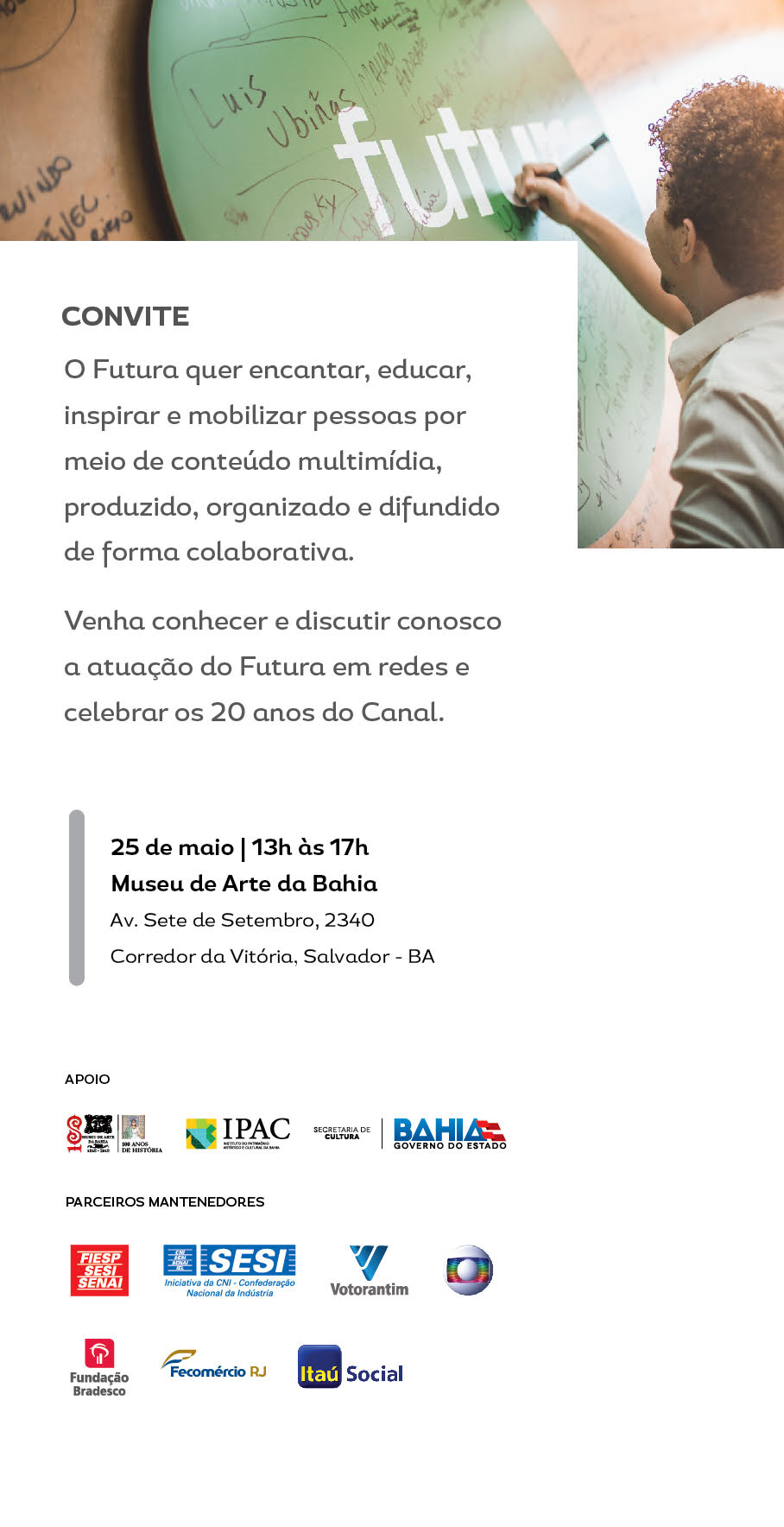 Em comemoração aos 20 anos do Canal Futura, será realizado nesta sexta-feira (25), às 13h, o anúncio do lançamento do Futura Play – que vai disponibilizar boa parte da programação em serviço on demand gratuito. O evento acontece no Museu da Arte da Bahia (MAB), no Corredor da Vitória, no centro de Salvador.