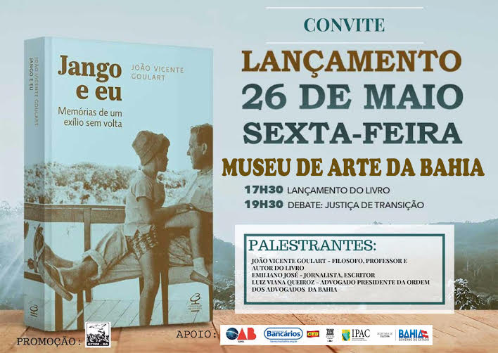“Jango e Eu – Memórias de um Exílio sem Volta”, livro escrito por João Vicente Goulart, filho do ex-presidente Jango, deposto pelo golpe militar de 1964, será lançado no Museu de Arte da Bahia nesta sexta-feira (26), a partir das 17:30. Antes, às 17h, o violonista Afonso Celso apresentará clássicos da música instrumental brasileira em recital de abertura e às 19h30 acontece o debate sobre “Justiça de Transição". Além do autor, farão parte da mesa o advogado Luis Viana Queiroz, presidente da OAB, e o jornalista Emiliano José.