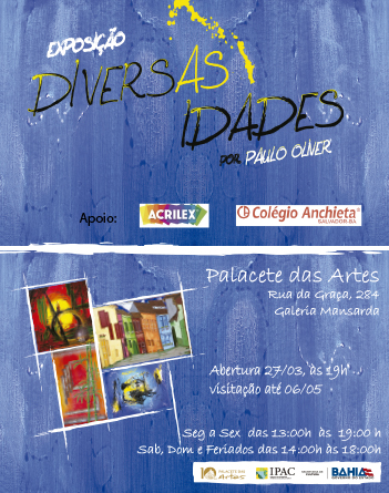 Com abertura dia 27 de março, às 19h, a Galeria Mansarda do Palacete das Artes recebe o artista Paulo Oliver em sua primeira exposição “DIVERSAS IDADES – Pinturas e esculturas”.