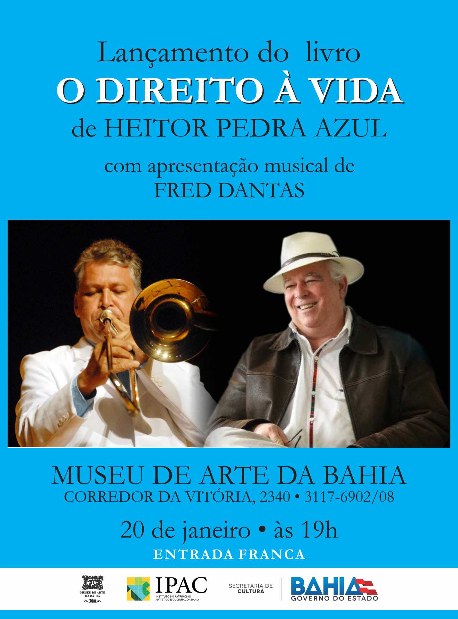 O mineiro Heitor Pedra Azul lança nesta sexta (20 ) às 19h, no Museu de Arte da Bahia, seu livro "O Direito à Vida", um resumo do repertório do concerto " Brésil Sertão et Mer" , realizado na França. O maestro Fred Dantas faz as honras da casa e toca composições do autor. Atividade franqueada ao público.