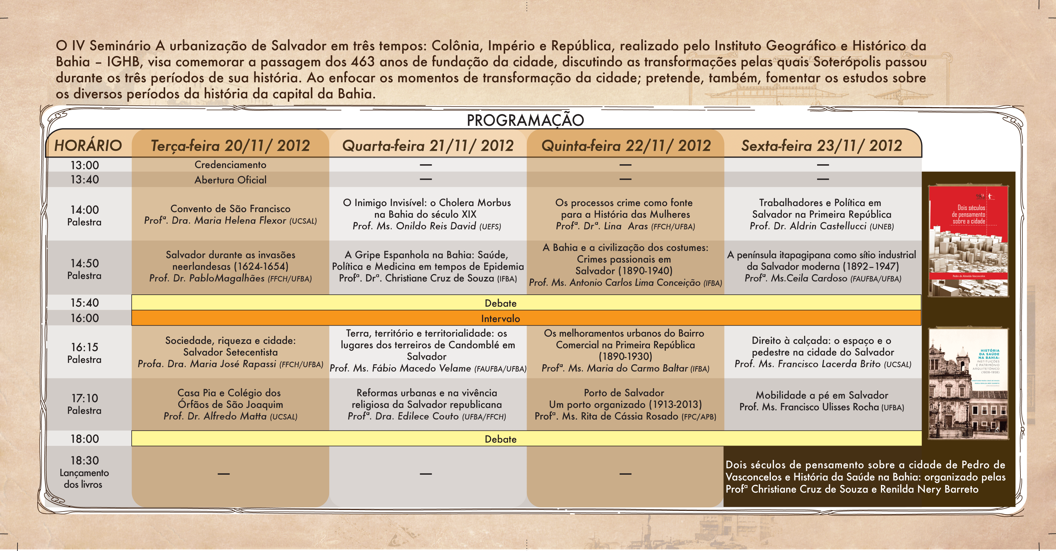 O Instituto Geográfico e Histórico da Bahia (IGHB) promove, entre os dias 20 a23 de novembro de 2012, a quarta edição do Seminário A urbanização de Salvador em três tempos: Colônia, Império e República. O evento visa comemorar a passagem dos 463 anos de fundação da cidade, discutindo as transformações pelas quais Soterópolis passou durante os três períodos de sua história. Ao enfocar os momentos de transformação da cidade; pretende, também, fomentar os estudos sobre os diversos períodos da história de capital da Bahia.