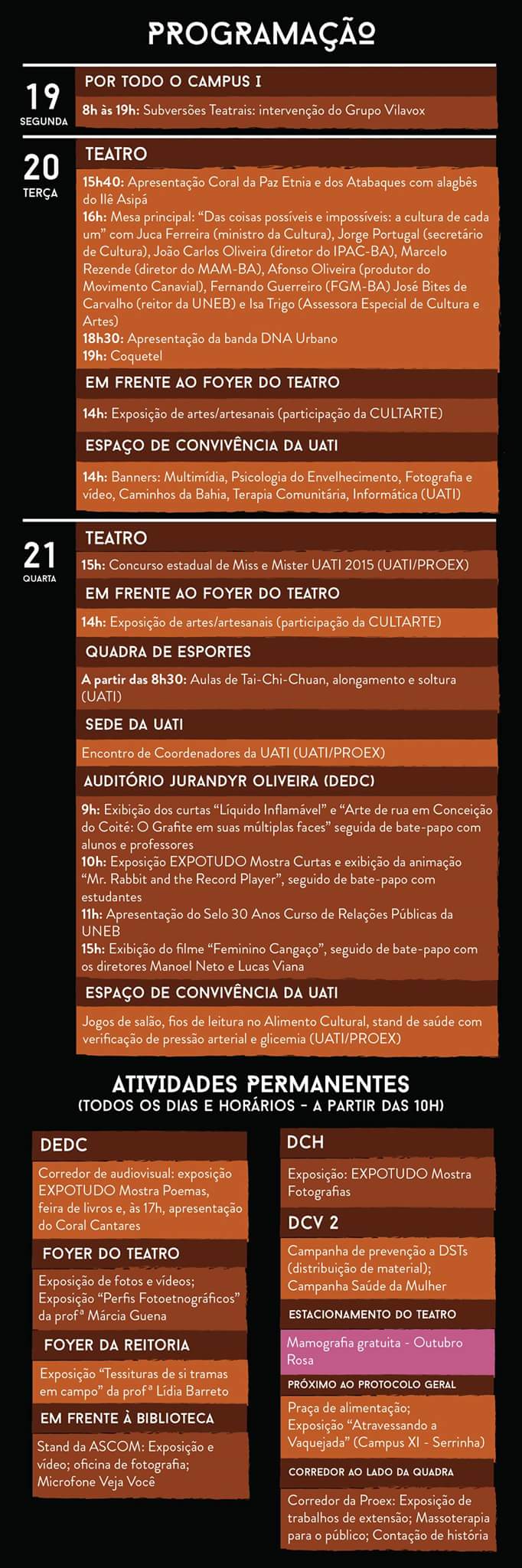A iniciativa, que este ano abordará o tema Veja Você!, vai reunir múltiplas produções e intervenções artísticas e culturais de toda a UNEB, na capital e interior do estado, e de suas comunidades adjacentes.