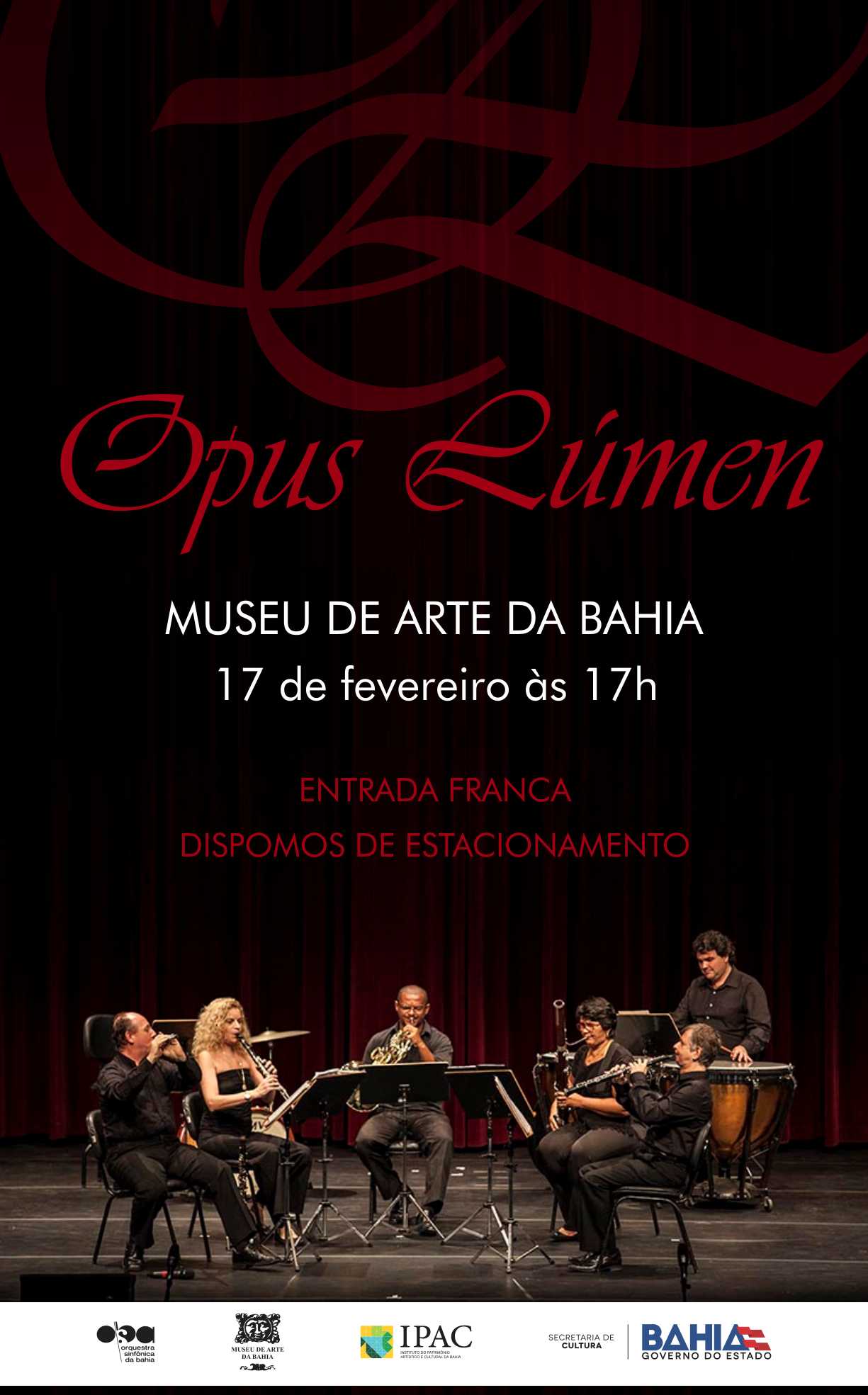 O Museu de Arte da Bahia apresenta na próxima sexta-feira ( 17 ) às 16h o Concerto da Camerata da Orquestra Sinfônica da Bahia " Sexteto Opus Lumen" para grande público. O projeto Música de Câmara é o resultado de esforços da Secretaria de Cultura, através do Teatro Castro Alves e tem por objetivo democratizar o acesso à música erudita e popular, contribuindo para a formação de novas platéias, explorando e divulgando obras de grandes compositores.