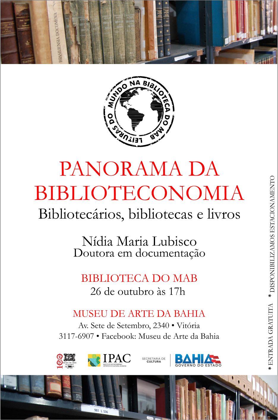O Museu de Arte da Bahia promove nesta quinta-feira (26), às 17h, a 18ª edição do Projeto "Leituras do Mundo", com palestra da doutora em Documentação Nídia Lubisco convidada pelo Mab para fazer um " Panorama sobre Biblioteconomia, Bibliotecários, Biblioteca e Livros ", tema escolhido como parte das comemorações pelo Dia Nacional do Livro, celebrado dia 29 de outubro em todo Brasil. Entrada gratuita.