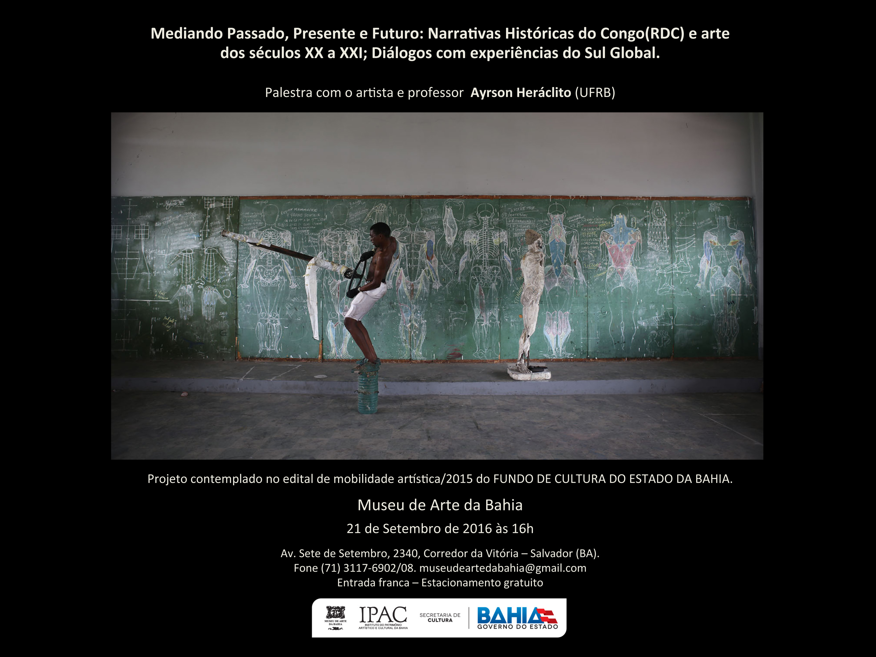O Professor Ayrson Heráclito, da UFRB (Cachoeira), também artista visual e curador será o palestrante convidado do Museu de Arte da Bahia nesta quarta, 21.9 às 16h para falar sobre sua vivência no Congresso na cidade de Kinshasa, na República Democrática do Congo, onde foi mediador dos estudos sobre o tema: "Mediando passado, presente e futuro: Narrativas Históricas do Congo (RDC) e Arte dos sécs. XIX a XX; Diálogos com Experiências do Sul Global". Essa palestra, aberta ao público, é uma contrapartida a contemplação do seu trabalho através do Edital de Mobilidade Artística do Fundo de Cultura do Governo do Estado da Bahia. GRATUITO