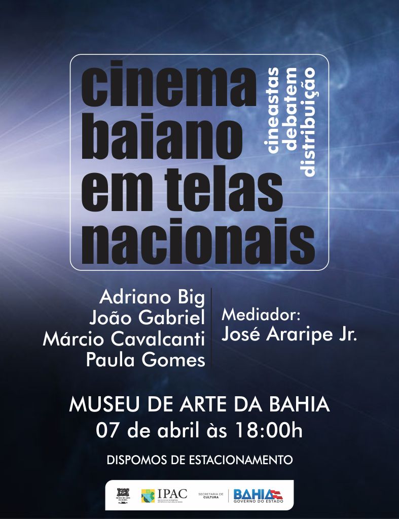 Cineastas baianos se reúnem nesta sexta-feira (7.4) às 18h. no Museu de Arte da Bahia para debater as formas de reforçar a relação com distribuidores e de potencializar os recursos, com criatividade, para driblar o cerco das multinacionais nas salas de cinema .Essa reflexão é do cineasta José Araripe Jr. também mediador do Encontro, sob a chancela do diretor do MAB, Pedro Arcanjo, que recebe como convidados do debate os cineastas Adriano Big, João Gabriel, Márcio Cavalcanti e Paula Gomes. A entrada é gratuita.