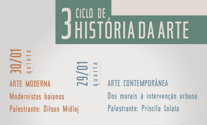 Seguem até 27 de janeiro as inscrições para o III Ciclo de História da Arte, realizado pelo Museu de Arte Moderna da Bahia (MAM-BA). O evento acontece nos dias 29, 30 e 31 de janeiro, no Centro Educacional Carneiro Ribeiro (Escola Parque), no bairro de Caixa d’Água, das 15h às 17h. As inscrições são gratuitas.