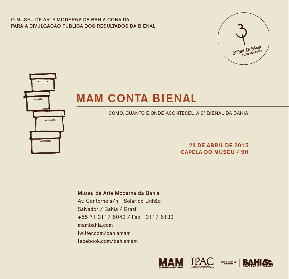 Na próxima quinta-feira, dia 23 de abril de 2015, às 9h da manhã, na Capela do MAM-BA, serão apresentados os resultados da 3ª Bienal da Bahia, projeto que envolveu diversas linguagens artísticas, dinamizou diferentes espaços, integrando circuitos e territórios para além da capital.