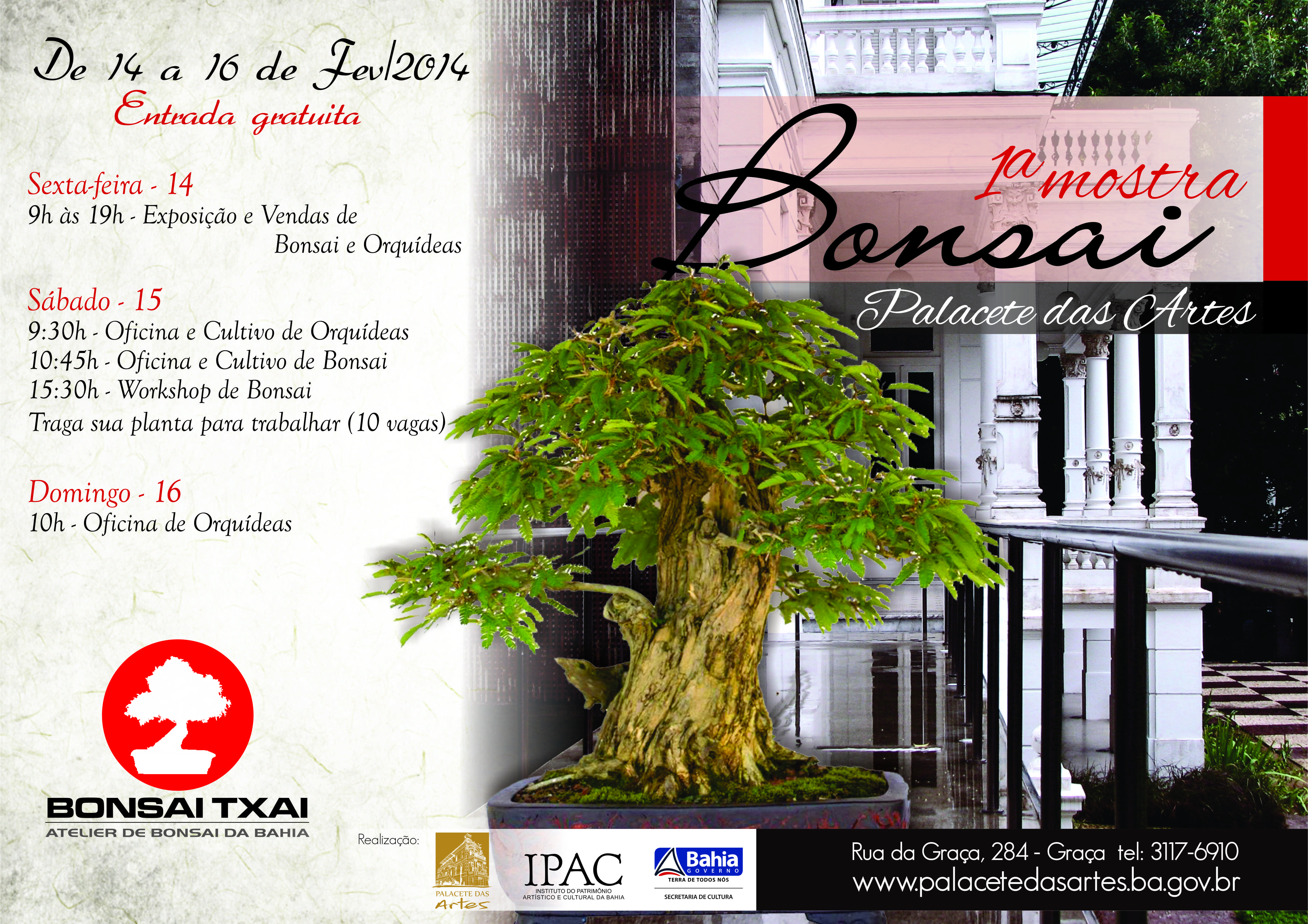 O Palacete das Artes apresenta ao público um fim de semana dedicado ao Bonsai, com a participação dos Orquidófilos Baianos Associados (OBA). A primeira mostra será realizada de 14 a 16 de fevereiro, das 9h às 19h. O encontro conta com oficinas gratuitas sobre cultivo de bonsai e de orquídeas, apresentadas pelos mestres Sergio Bittencourt e João Frigo. Uma exposição com fotografias de Claudio Colavolpe completará a mostra.