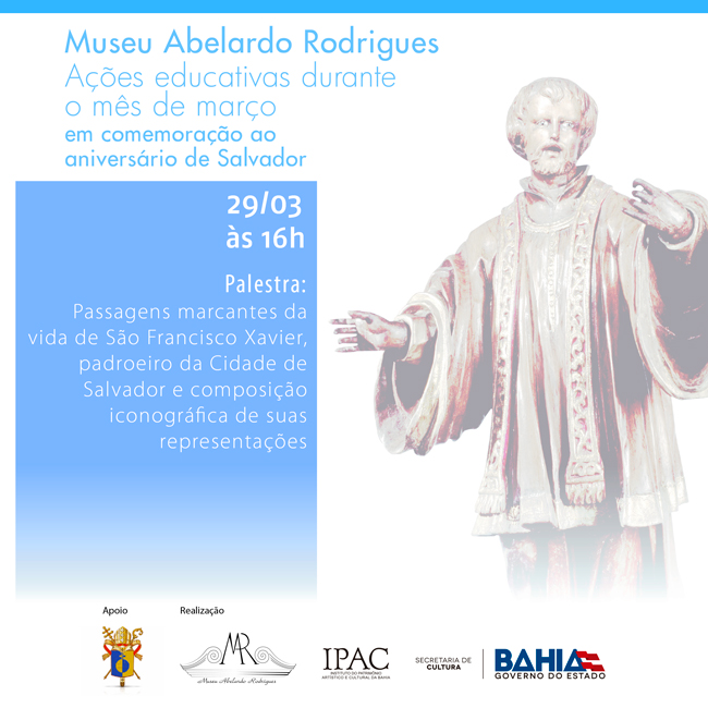 O Museu Abelardo Rodrigues - (Pelourinho) promove, nos últimos dias de março, visita mediada e palestra em homenagem a São Francisco Xavier, integrando as comemorações pela passagem dos 467 anos da fundação da Cidade de Salvador (29/03). A palestra “Passagens marcantes da vida de São Francisco Xavier, padroeiro da Cidade de Salvador e composição iconográfica de suas representações” acontece em 29/03, às 16h, no próprio museu, e terá como palestrante o Padre Danilo Pinto, coordenador da Pastoral da Cultura na Arquidiocese de São Salvador e assessor Nacional da CNBB.