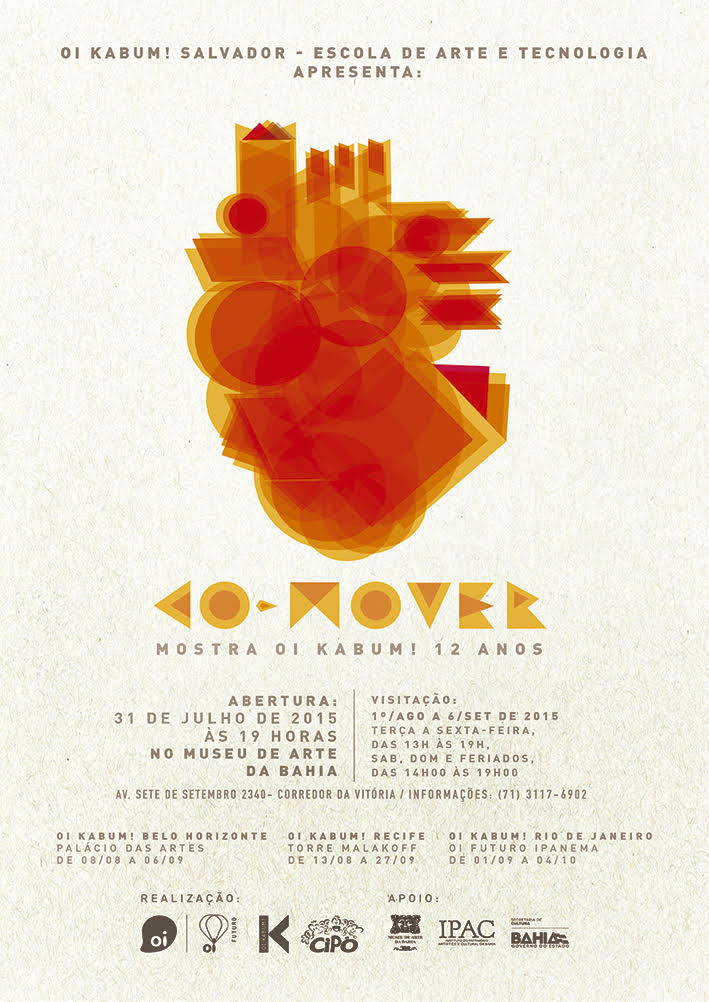 No próximo dia 31 às 19h, o Museu de Arte da Bahia e a Oi Kabum inauguram a mostra CO-MOVER, que marca a comemoração de 12 anos da Oi Kabum! Escola de Arte e Tecnologia, programa do Oi Futuro, instituto de responsabilidade social da Oi, em parceria com a CIPÓ - Comunicação Interativa. A exposição reúne trabalhos de Computação Gráfica, Fotografia, Design Gráfico e Vídeo, produzido pelos jovens das seis turmas que passaram pela escola nos últimos anos, tanto na sede de Salvador, quanto nas demais sedes, em Recife, no Rio de Janeiro e em Belo Horizonte.