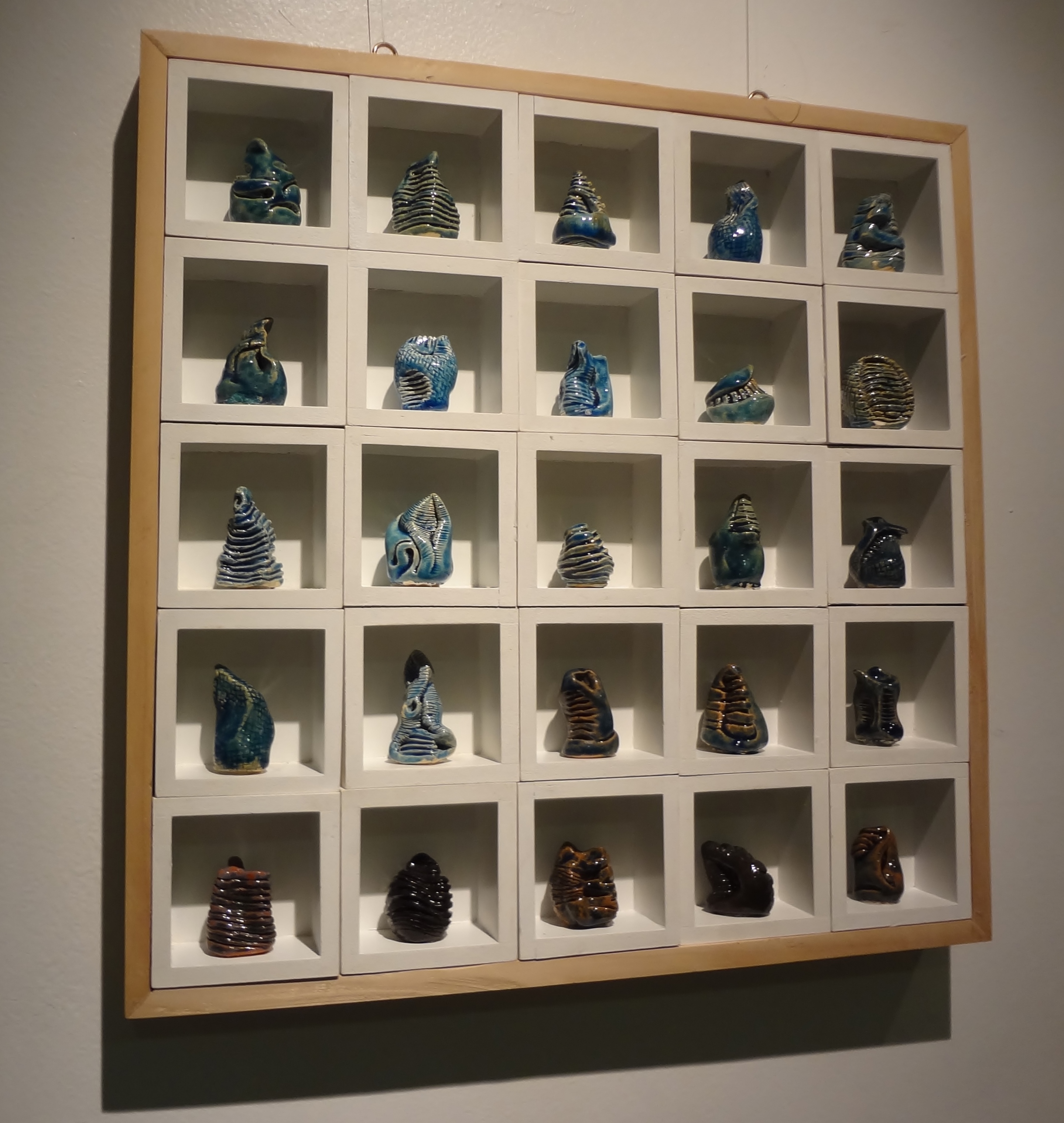 Partindo de um objeto híbrido que une cerâmica e experimentos fotográficos, o relicário, Milena Oliveira propõe uma poética que aprofunda-se em petrificar sentimentos e memórias. “As peças se referem à relação de resguardar objetos, lembranças e desejos e tê-los como um amuleto de sorte, um apego afetivo ou algo sagrado”, explica. Verô Muniz traduz a ideia de singularidade num conjunto, evidenciada em cores, tamanhos e formas diferentes, com a obra “Papilares”. A artista buscou inspiração nas impressões digitais e na ideia de unicidade que elas traduzem.