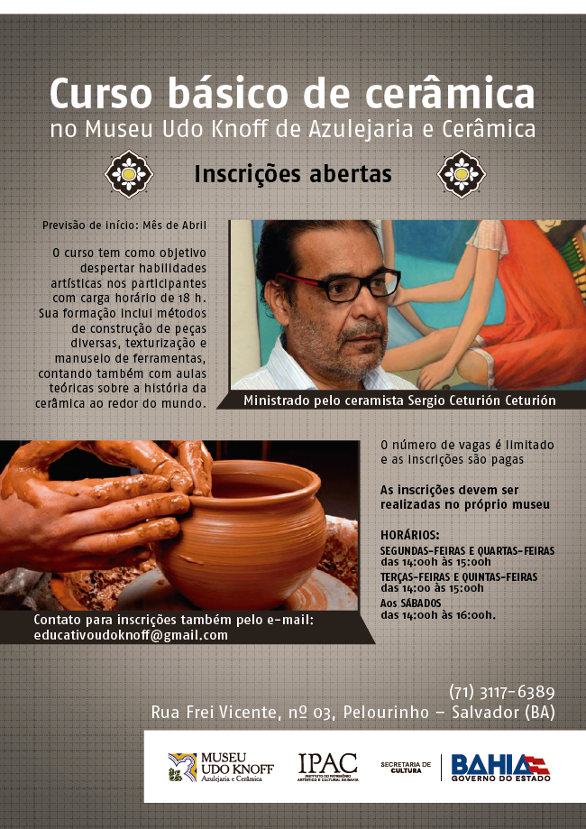 O Museu Udo Knoff de Azulejaria e Cerâmica (Rua Frei Vicente, Pelourinho) promove, durante o mês de abril, o curso de iniciação em cerâmica. O curso tem como objetivo despertar habilidades artísticas nos participantes através de construção de peças diversas, texturização e manuseio de ferramentas, contando também com aulas teóricas sobre a história da cerâmica ao redor do mundo. O curso será formado por três turmas: segundas e quartas-feiras, e terças e quintas-feiras, das 14h às 15h; e aos sábados, das 14h às 16h. O projeto será ministrado pelo ceramista Sergio Centurión Centurión formado pela Escola de Artes Aplicadas de Montevidéu-ROU.