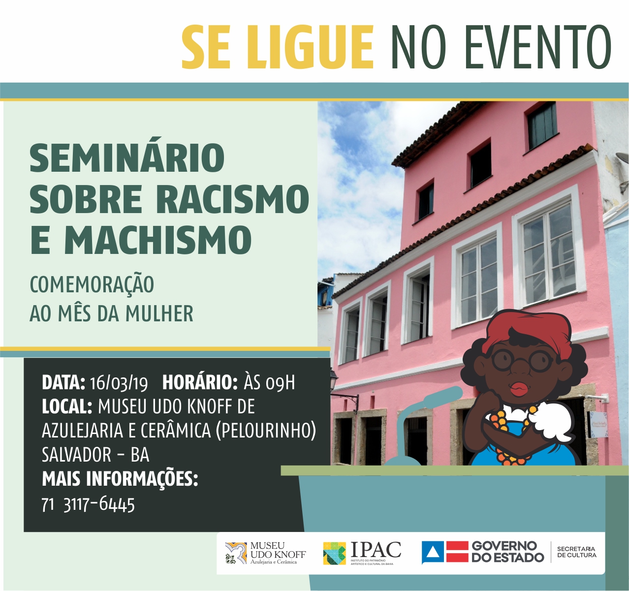 Em comemoração ao mês da mulher, o Museu Udo Knoff de Azulejaria e Cerâmica (Pelourinho) promove no próximo dia 16/03, a partir das 9h um seminário sobre o olhar feminino, sob a perspectiva da psicologia, acerca das lutas contra o racismo e machismo nos dias atuais. Aberto ao público, o evento é uma parceria com o Grupo de Estudos em História da África e Diáspora. A atividade possui 30 vagas e as inscrições podem ser feitas diretamente no museu ou através do telefone (71) 3117-6389.