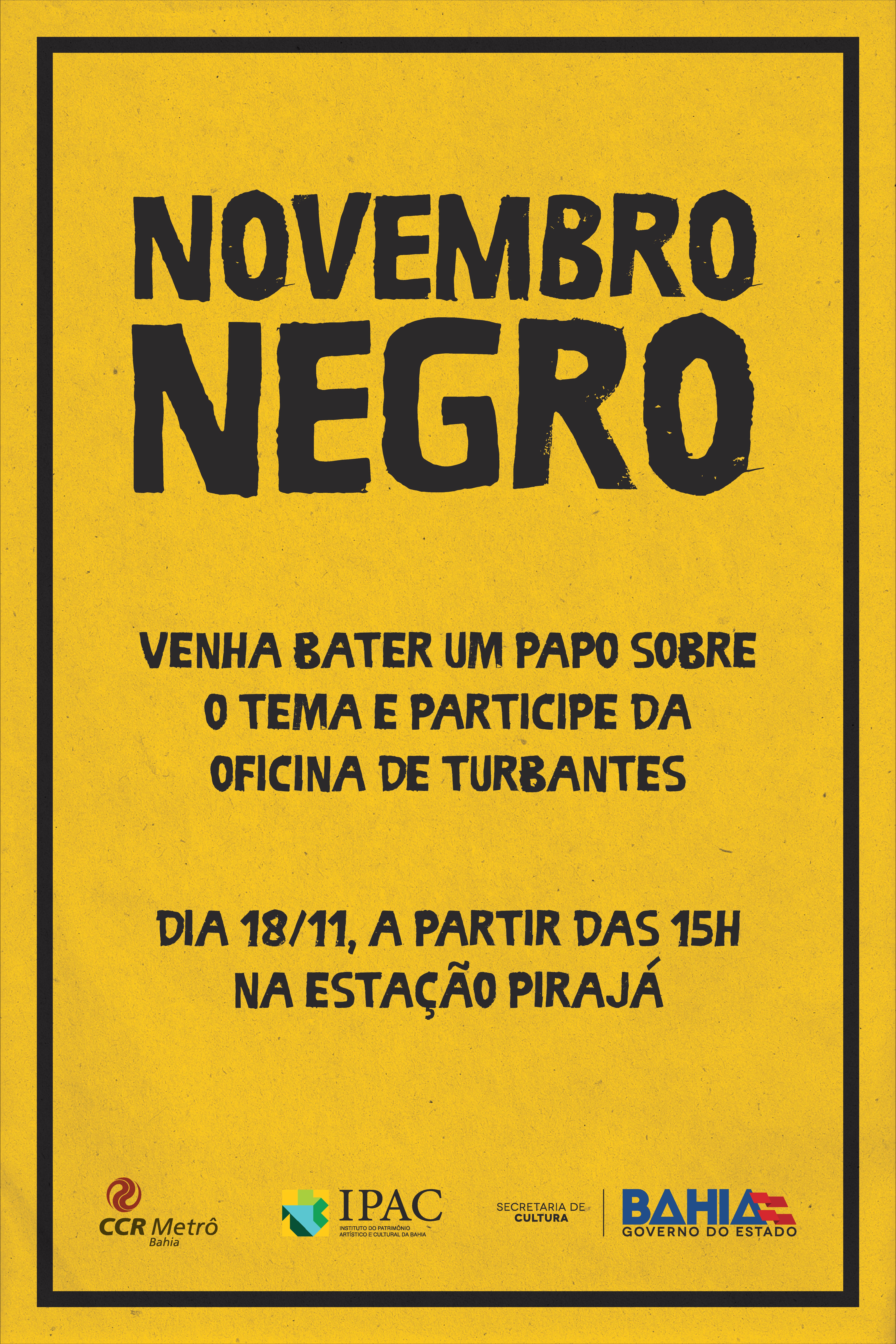 As comemorações pelo Novembro Negro chegam mais cedo à Estação Pirajá do Metrô com a realização de atividades abertas ao público a partir das 15h desta sexta-feira (18/11). Promovido em parceria pela CCR Metrô Bahia, o IPAC (Instituto do Patrimônio Artístico e Cultural da Bahia) e a Dimus (Diretoria de Museus), o evento inclui bate-papo e oficina de turbante.