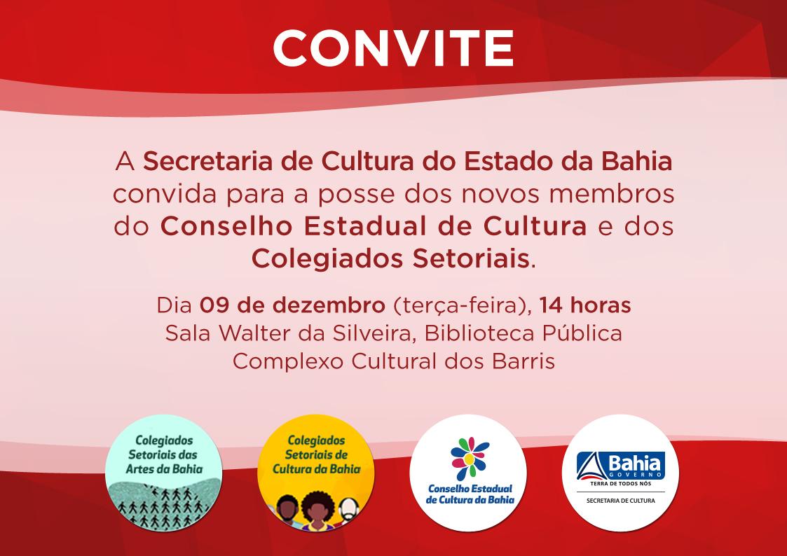 Conselho de Cultura - Será a primeira vez que conselheiros eleitos pela sociedade civil integrarão o órgão. São 10 representantes dos territórios de identidade cultural e 10 eleitos pelos setores culturais e dos fazeres, todos com seus respectivos suplentes. A composição do Conselho é finalizada com outros 10 nomes indicados pelo poder público e seus suplentes. Isso deixará o órgão com um total de 60 integrantes, sendo dois terços de sociedade civil e um terço de poder público. Criado em 1967, o Conselho de Cultura é colegiado da Secretaria de Cultura do Estado da Bahia (SecultBA). Possui caráter normativo e consultivo, com a missão de contribuir na formulação de políticas culturais e intermediar a relação entre a sociedade civil e o Estado.