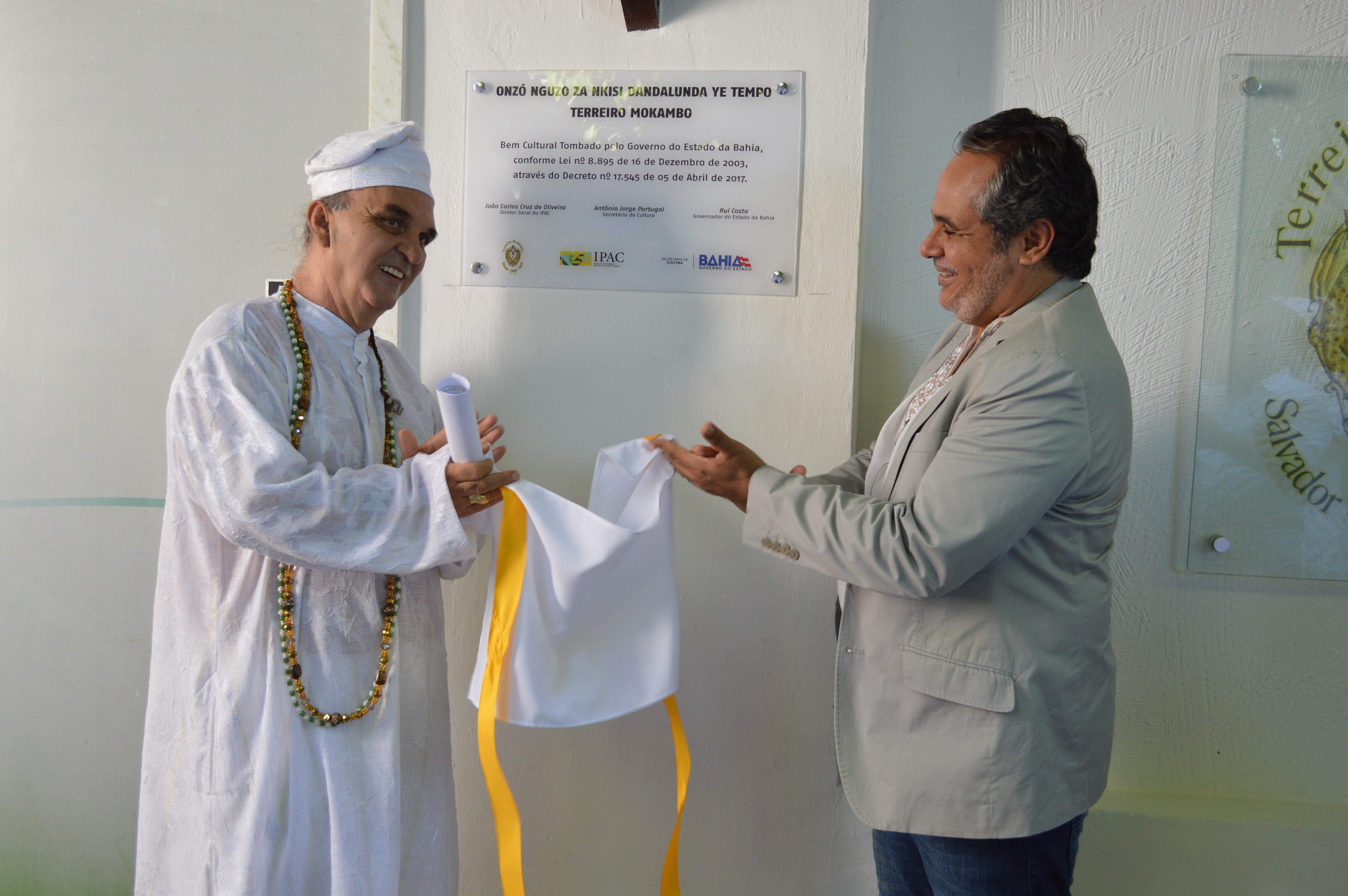 “O tombamento traz respeitabilidade por parte do Estado não só para o Mokambo, mas para toda a religião de matriz africana na Bahia, para um povo que sofreu por séculos por exercer a sua cultura”. Com essas palavras, o Taata Anselmo Santos, do Terreiro do Mokambo, traduziu a emoção com que recebeu o certificado e placa de ‘Patrimônio da Bahia’ entregue ontem (23) à tarde pelo diretor geral do Instituto do Patrimônio Artístico e Cultural (IPAC), João Carlos de Oliveira. “Até poucos anos atrás, na década de 1970, os candomblés tinham que pedir permissão à Polícia do Estado da Bahia”, completou o zelador do terreiro Onzó Nguzo za Nkizi Dandalunda Ye Tempo que descende do Terreiro São Jorge Filho da Goméia, da famosa Mãe Mirinha do Portão (Altanira Souza 1924—1989).