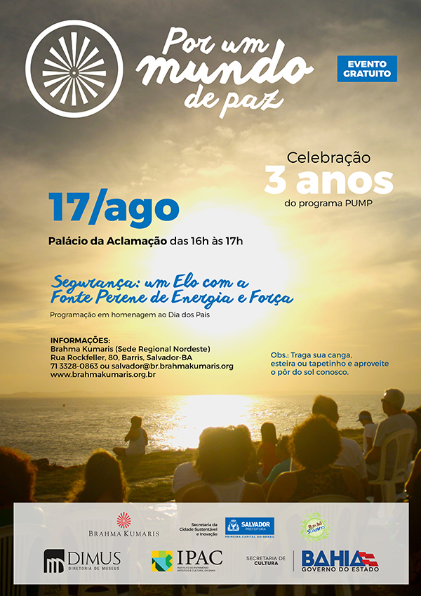 Celebrando três anos de existência, o programa de meditação ‘Por um Mundo de Paz – PUMP’ escolheu o Palácio da Aclamação (Campo Grande) para a edição comemorativa que acontece na próxima quinta-feira (17), das 16 às 17h. O evento, aberto ao público, traz o tema ‘Segurança: um elo com a fonte perene de energia e força’ em homenagem ao Dia dos Pais. “O espaço é propício para a atividade, pois além de contemplarem o pôr-do-sol, os participantes poderão apreciar os jardins e esculturas de arte que compõem o entorno”, declara Maria Auxiliadora Sampaio Silva, coordenadora do PUMP, da Organização Brahma Kumaris. É recomendado levar, opcionalmente, cangas, esteiras e tapetes.