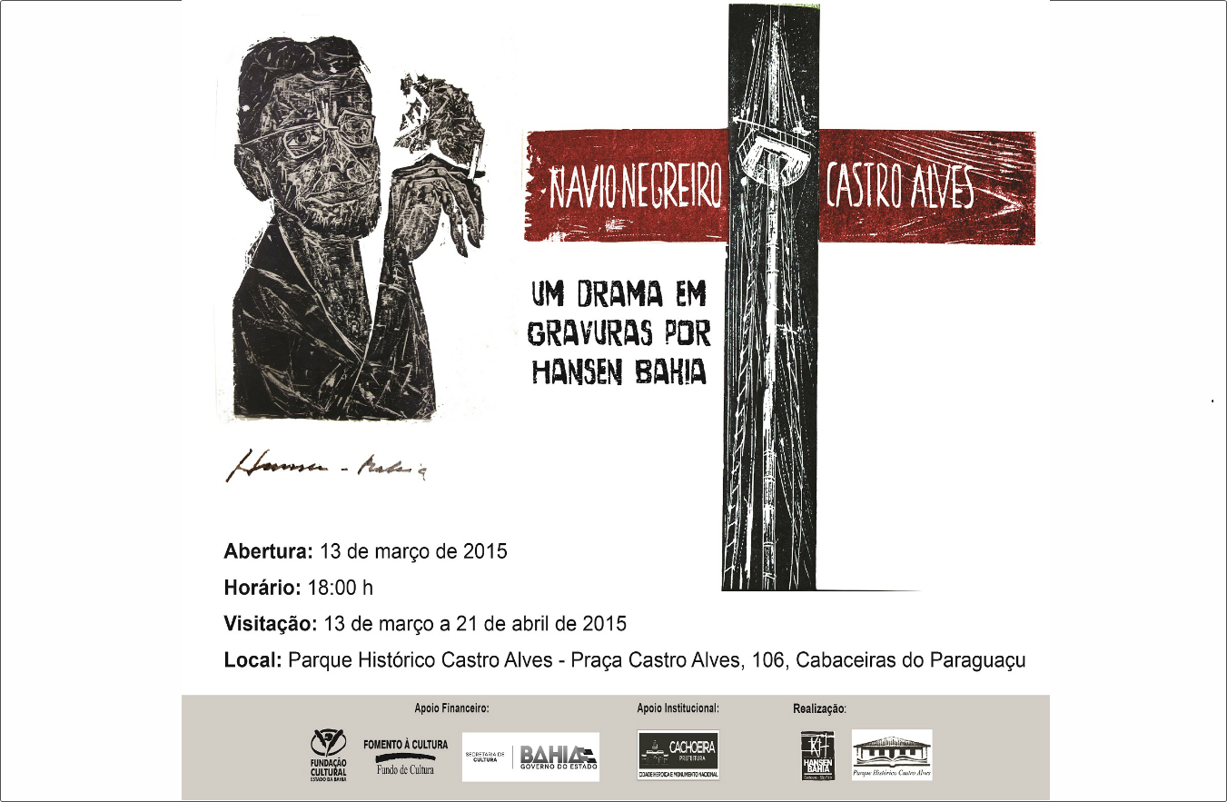 O Parque Histórico Castro Alves, localizado em Cabaceiras do Paraguaçu no Recôncavo baiano, inaugura em 13/03 a exposição “Navio Negreiro de Castro Alves – Drama em Gravuras”, por Hansen Bahia. A abertura da mostra terá início às 18h, após o Festival de Declamação de Poemas de Antônio de Castro Alves, e contará com apresentação da Filarmônica Lira Ceciliana de Cachoeira.