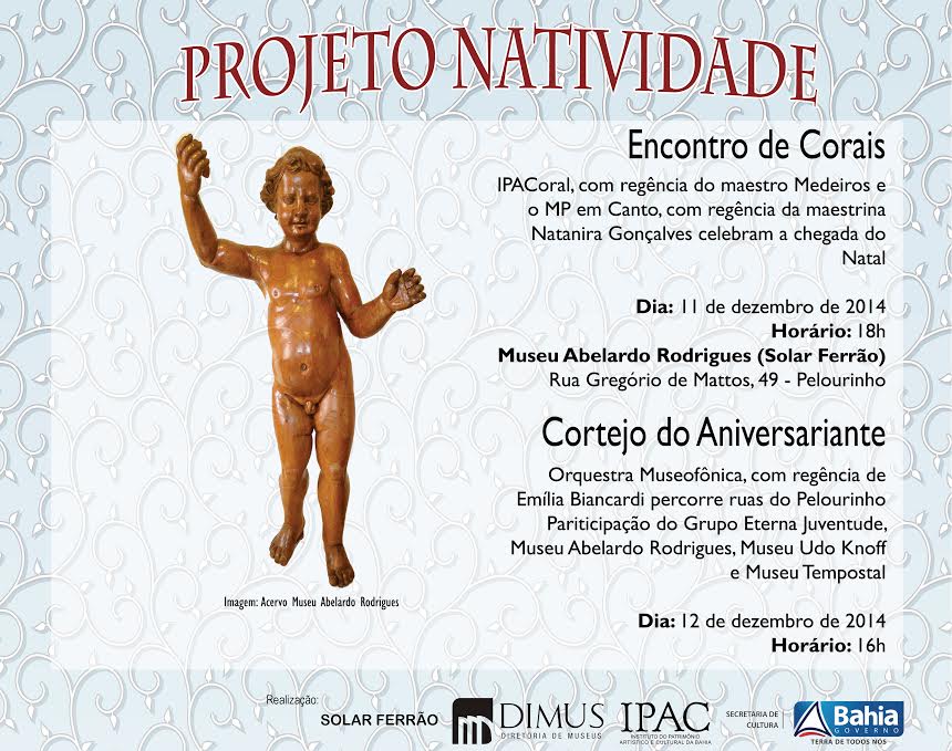 Envolvendo o Museu Abelardo Rodrigues, o Centro Cultural Solar Ferrão, o Museu Tempostal e o Museu Udo Knoff de Azulejaria e Cerâmica, todos localizados no Pelourinho, o projeto Natividade surge como ação sociocultural e educativa promovida pela Diretoria de Museus do Instituto do Patrimônio Artístico e Cultural da Bahia (Dimus/Ipac) para o final de ano.