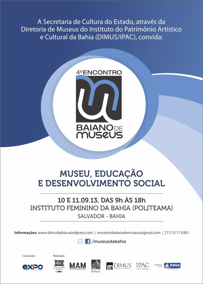 Depois de Ilhéus, em 2011, este ano é a vez da capital baiana sediar o 4º Encontro Baiano de Museus, que acontece amanhã (10 de setembro) e quarta-feira (11), no Instituto Feminino da Bahia (Politeama), das 9h às 18h. Realizado pela Diretoria de Museus do Instituto Artístico e Cultural da Bahia (DIMUS/IPAC), o evento constitui um importante espaço de intercâmbio de experiências entre museus, sociedade civil, instituições públicas e privadas, universidades e órgãos de gestão municipal, estadual e federal. A iniciativa pretende definir diretrizes para o setor na Bahia, consolidando a Política Setorial de Museus, em consonância com a Política Nacional de Museus (PNM).