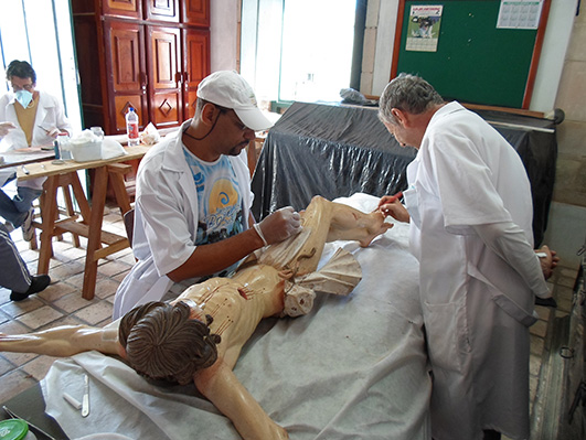 CUIDADO e EDUCAÇÃO – “O processo de restauração é longo e necessita de cuidado. Fazemos limpeza, fixação de estratos, remoções, recomposição das faltas, reintegração da policromia, douramento, aplicação de verniz, dentre outras ações”, ressalta Rozelita Sá Barreto, uma das restauradoras, juntamente com os restauradores Claudio Brito, Bruno Visco e Célia Moura. Foram beneficiadas duas portas e quatro janelas das sacristias da Igreja do Rosário, com desmontagem, limpeza, retirada de oxidados, recomposição e colagem, além de contenção emergencial na Igreja do Catolé, onde uma das imagens também foi restaurada. Durante as obras, foram feitas visitas da comunidade local, seminaristas e estudantes guiados por restauradores do instituto. “O restauro de bens artísticos responde à missão do IPAC, de preservação do patrimônio cultural. A comunidade de Piatã acompanhou as ações com grande interesse”, lembra a coordenadora de Restauro de Elementos Artísticos (Cores) do IPAC, Milena Tavares.