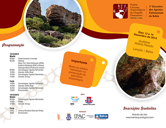 Com o objetivo de estimular o conhecimento e o fortalecimento de iniciativas individuais ou coletivas em prol dos bens arqueológicos baianos, a Secretaria de Cultura do Estado (Secult-BA) e a Universidade Federal da Bahia (UFBA) abrem inscrições para o 1º Encontro de Agentes Patrimoniais da Chapada Diamantina. O evento é aberto ao público e acontece nos dias 13 e 14 (dezembro, 2013), mas as inscrições já devem ser antecipadas através do site www.bahiaarqueologica.ufba.br.