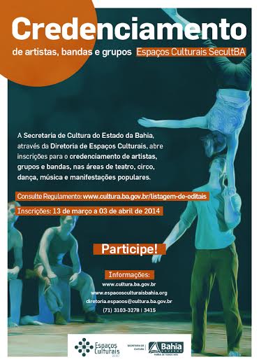 Artistas, grupos e bandas da Bahia, é tempo de divulgar seus trabalhos! A Secretaria de Cultura do Estado (SecultBA), através da Diretoria de Espaços Culturais (DEC), abre inscrições para credenciamento de artistas para apresentações artístico -culturais nos projetos e eventos dos  espaços culturais, da capital e do interior. As inscrições podem ser realizadas até o dia 03 de abril para grupos com atividades ligadas à música, dança, circo, teatro,  manifestações populares e voltadas para o público infantil. A iniciativa faz parte do conjunto de ações para consolidação de uma política pública democrática para a cultura baiana.