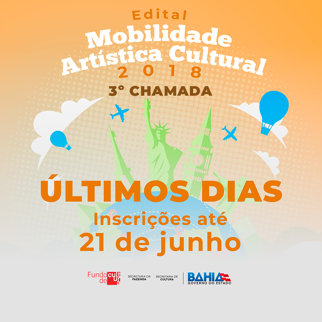 Continuam abertas, até a próxima quinta-feira (21 de junho), as inscrições para a terceira chamada do Edital de Mobilidade Artística e Cultural 2018. A chamada é destinada a atividades a serem desenvolvidas entre novembro de 2018 até janeiro de 2019. A nova chamada dispõe de recursos do Fundo de Cultura da Bahia no valor de R$ 400 mil, sendo que as propostas têm o limite de R$ 50 mil para projetos de Intercâmbio e Difusão; e R$ 25 mil para projetos de Residência Artística e Cultural e Formação Artística e Cultural.