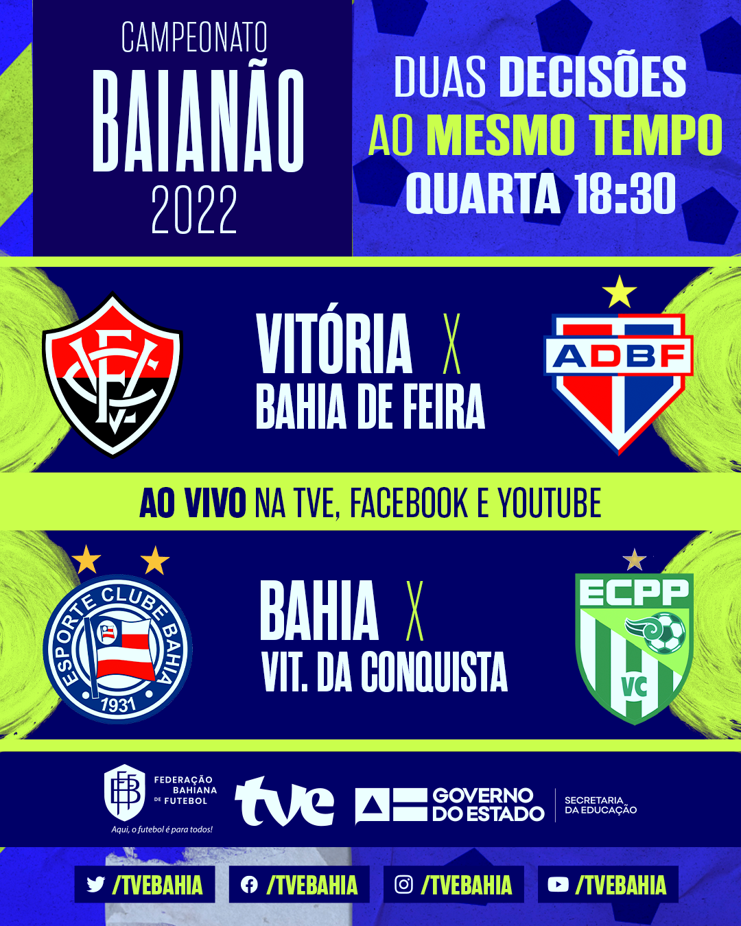 Serviço: Última rodada do Baiano tem Bahia e Vitória ao vivo na TVE Bahia e Vitória da Conquista Vitória e Bahia de Feira Quando: Quarta-feira (16), às 18h30 (pré-jogo) Onde: TVE, Youtube e Facebook