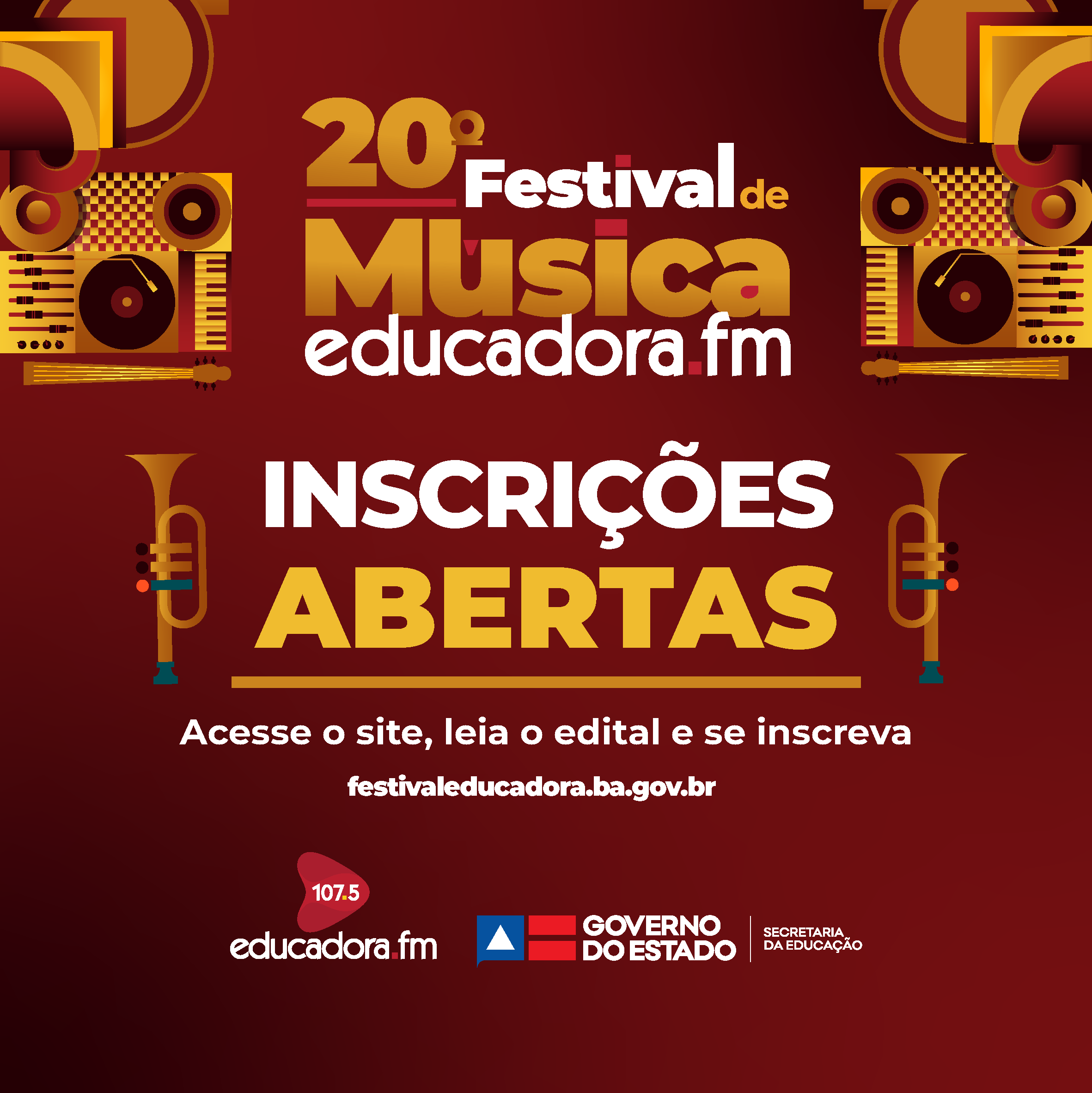 Abriram nesta segunda-feira, 13 de junho, as inscrições para o 20° Festival de Música Educadora FM, o maior festival de composições inéditas da Bahia. As inscrições podem ser feitas até o dia 12 de julho pelo site festivaleducadora.ba.gov.br. Este ano, a premiação foi ampliada para 100 mil reais e contemplará todos os 50 finalistas.