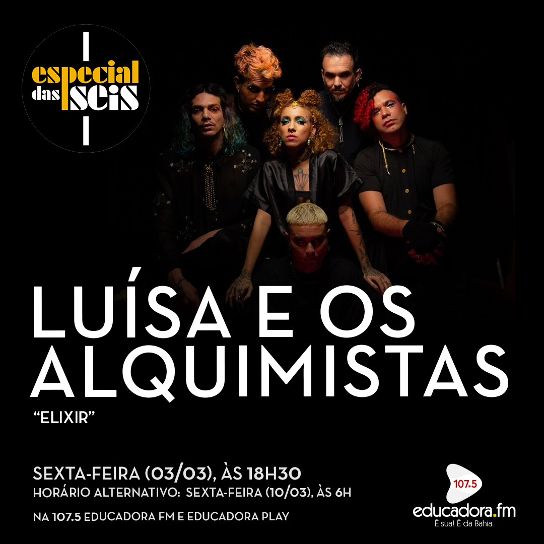 No Especial das Seis desta sexta-feira (03) você vai curtir o som da banda pop potiguar Luísa e os Alquimistas com o quarto e mais recente álbum, “Elixir”, lançado em 2022. O disco apresenta um caldeirão de gêneros musicais, de forma autêntica, em pleno diálogo com a contemporaneidade eletrônica e ao mesmo tempo lança mensagens de positividade e leveza através das letras das canções.