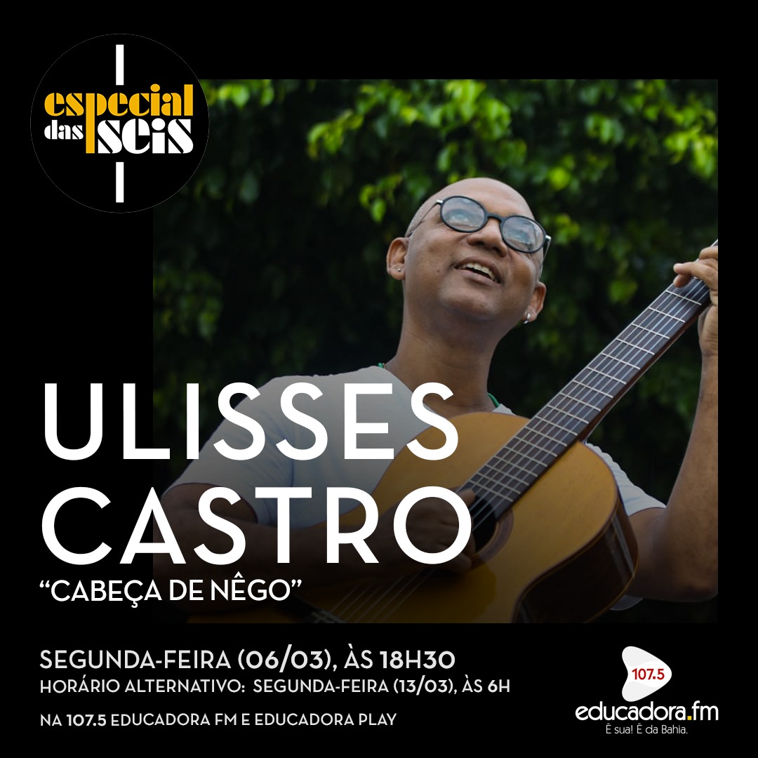 Nesta segunda-feira (06), o Especial das Seis destaca “Cabeça de Nêgo”, primeiro trabalho do cantor, compositor e arranjador baiano Ulisses Castro, que apresenta o programa. Com dez faixas, o álbum foi lançado em julho de 2021 e traz a produção musical, mixagem e masterização assinada por Sebastian Notini. O disco tem ainda a participação dos músicos Mateus Aleluia, Kiko Souza, Iuri Passos, Adriano Azevedo e Claudio Badega. Nesta edição, além dos detalhes sobre o trabalho, você vai conferir “Abiã”, canção que já foi gravada por Mariene de Castro, “Comando Doce”, “Ogun Yê”, “Alafya”, entre outras músicas.