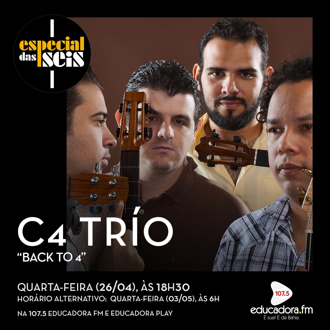 O Especial das Seis desta quarta traz como destaque “Back To 4”, o mais novo trabalho do grupo venezuelano C4 Trío, vencedor do Grammy Latino 2022 como “Melhor Álbum Instrumental”. Produzido em parceria com o baixista americano Michael League, este trabalho traz 09 faixas escritas pelos próprios integrantes da banda e misturam jazz, calipso, merengue, e joropo, gênero musical semelhante ao flamenco espanhol.