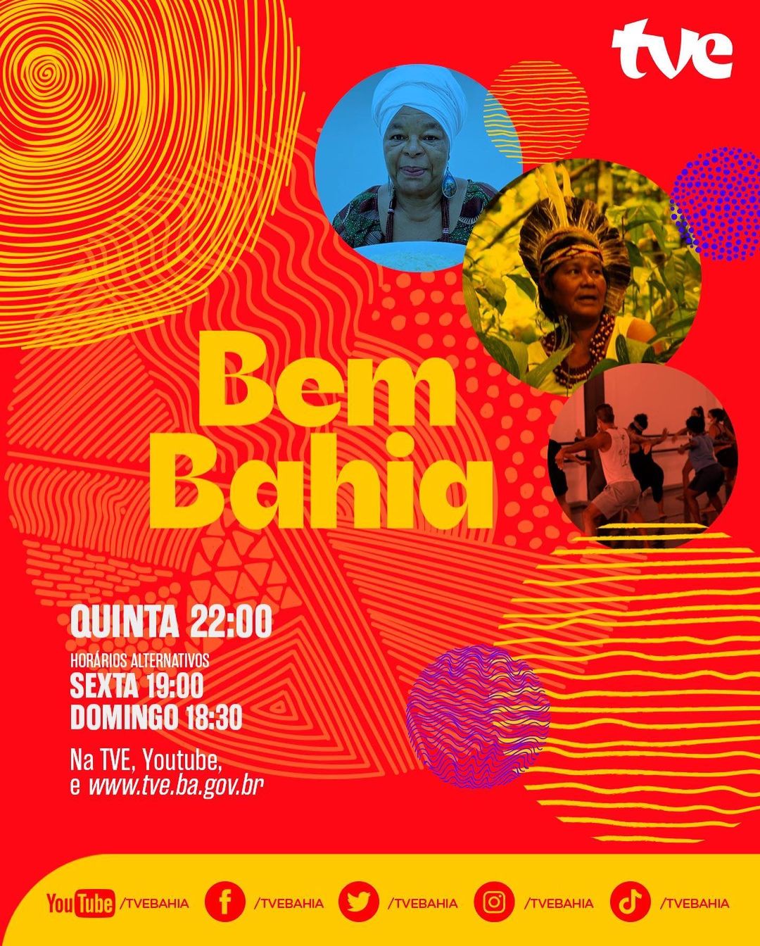 Nesta quinta-feira (27), o Bem Bahia vai até o extremo Sul do estado na aldeia Novos Guerreiros para conhecer a Pajé Japira Pataxó e falar sobre o recém-lançado livro ‘Saberes dos Matos Pataxós’. O programa vai mostrar ainda a série Comida de Terreiro, realizada pela Mãe Rosa de Oyá, e fazer uma homenagem ao Dia Internacional da Dança. O Bem Bahia vai ao ar todas às quintas-feiras, às 22h, com horários alternativos às sextas-feiras, às 19h, e aos domingos, às 18h30.