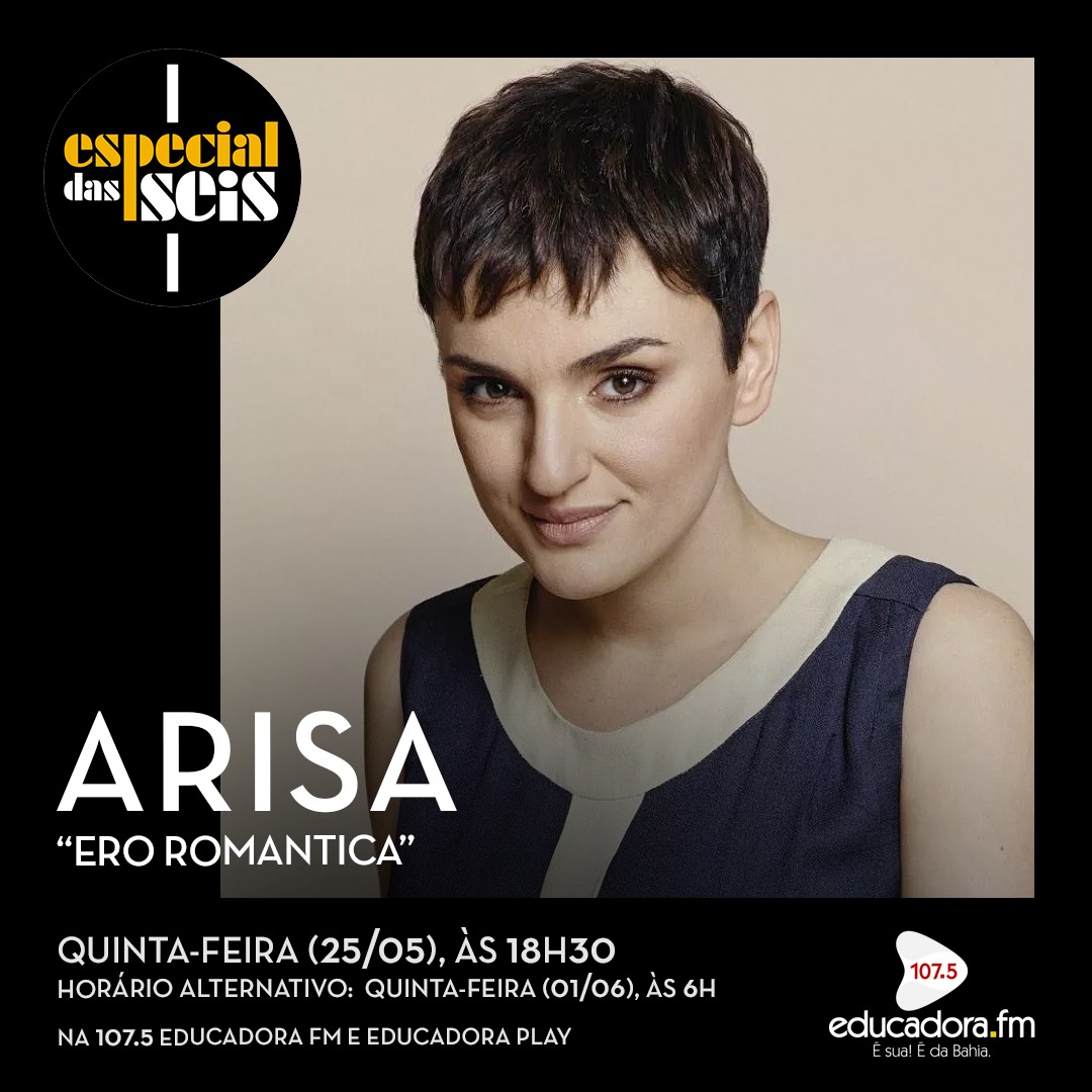 O Especial das Seis desta quinta-feira (25) convida você para conhecer e curtir do som da cantora e compositora italiana Arisa com destaque para o álbum “Ero Romantica”, o sétimo e mais recente trabalho de inéditas, que traz um repertório de 11 faixas e foi lançado em novembro 2021, em plena pandemia de COVID-19.